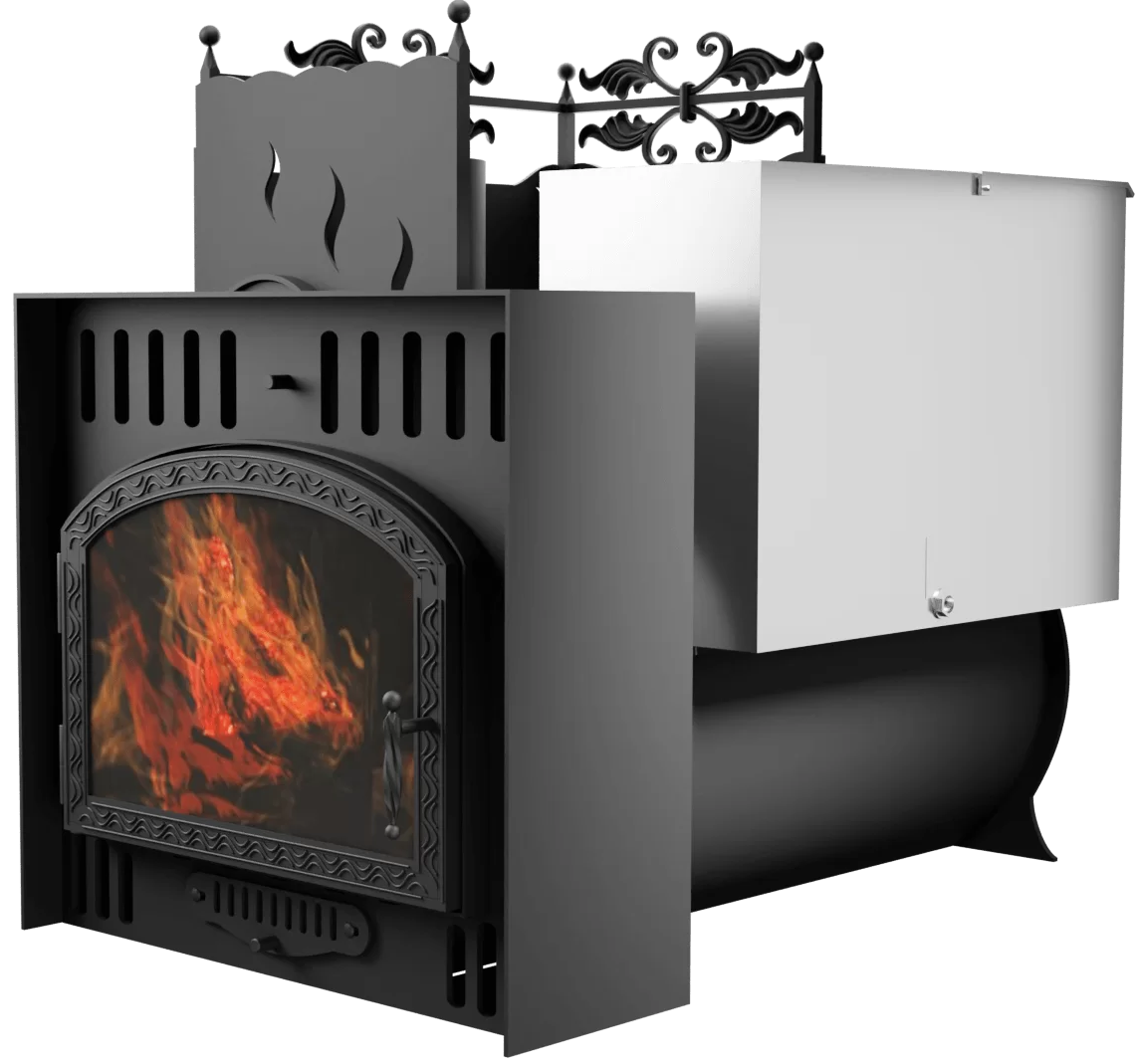 Печь Горыныч 3, каменка закрытая с парогенератором с левой стороны, большая дверь со стеклом