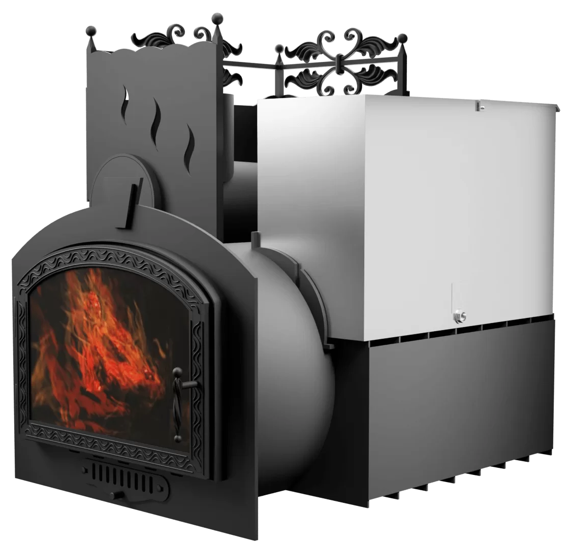 Печь Горыныч 3, каменка закрытая с парогенератором с левой стороны, большая дверь со стеклом