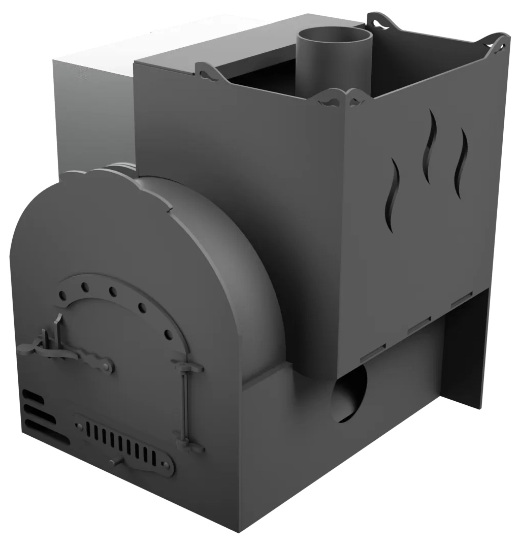 В комплектации данной модели предусмотрена система воздушного отопления, которая способна обогреть комнату отдыха до 40 м3. В конструкции печи предусмотрен дополнительный контур. Система подключается к электричеству, вентилятор подает холодный воздух, который прогреваясь от печи выходит в комнату отдыха. В комплект входит, вентилятор, гофрированная труба 1 метр, хомуты и обратный клапан.